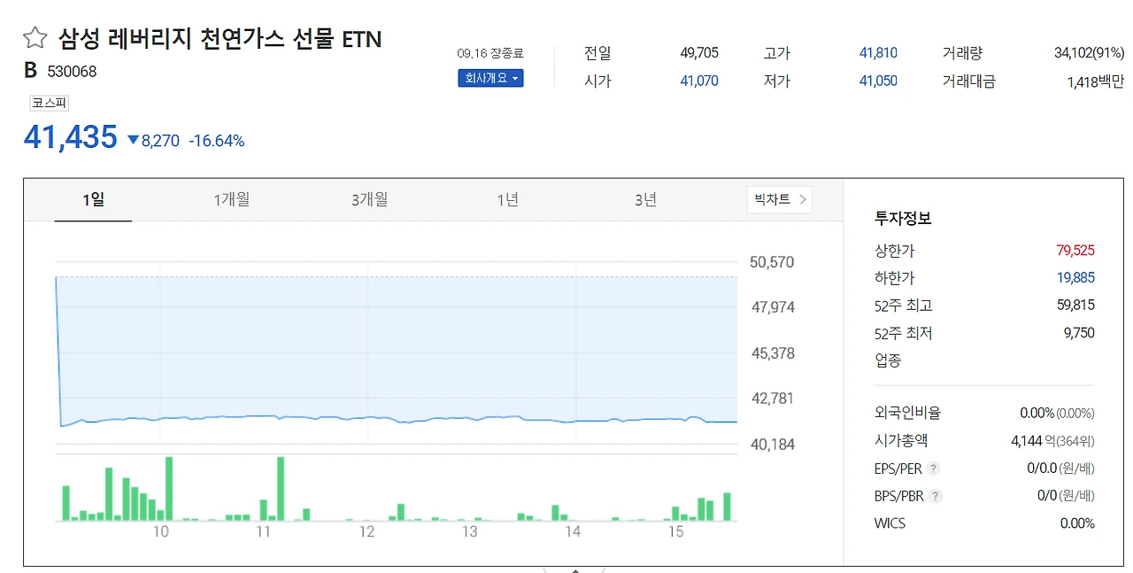이 상품은 '-16.64%' 하락했습니다. 천연가스 가격이 전일 대비 6% 가량 하락한 상황을 고려하면 대략 2.5배의 레버리지 상품이라 볼 수 있습니다. 비교적 안정적이네요.