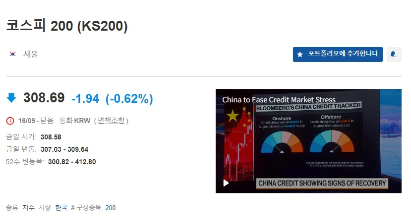 9월 16일 장이 마감된 상태를 기준으로 코스피 200 종목의 종합지수입니다. 코스피200은 1990년 당시의 기업가치를 '100'으로 설정하였으며, 현재는 3배 성장했군요.