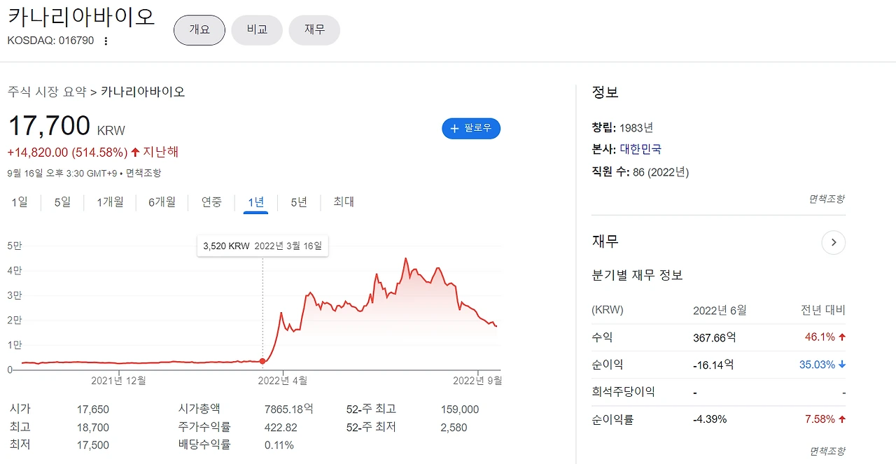 카나리아바이오(구 현대 사료)와 같은 작은 회사가 몇 달 사이에 수십 배로 성장하는 기이함을 보여주고 있습니다.