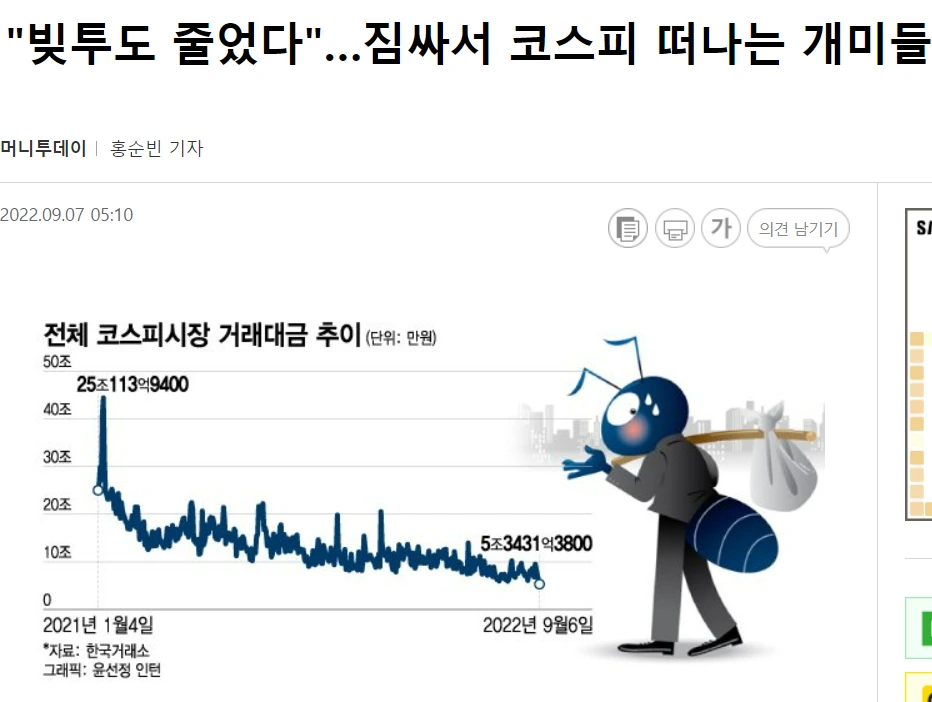 반면, 코스피 전체의 거래 대금은 지속적으로 하락세를 보이고 있습니다.