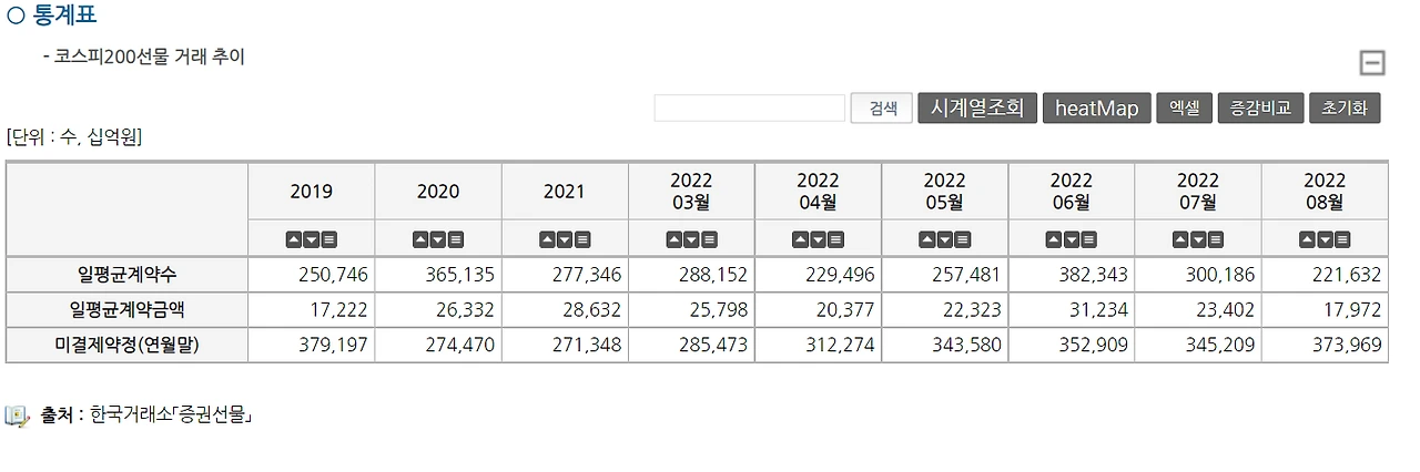 코스피 200 선물의 거래 대금은 2022년 8월 기준으로 일평균 '17조 9720억 원'이 거래되고 있습니다. 전반적으로 일일 선물 거래대금이 20조원 규모를 웃돌고 있습니다