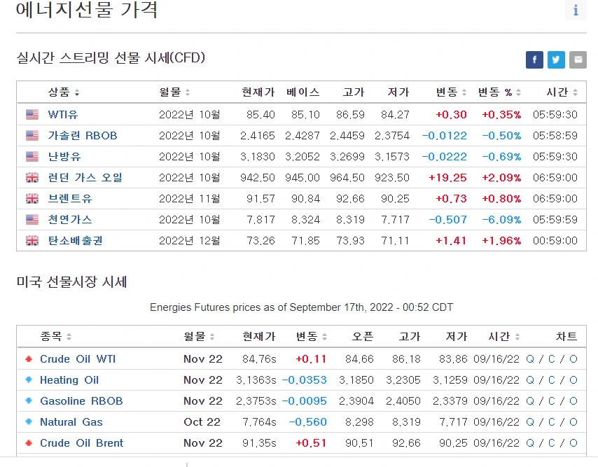 2022년 9월16일에 장이 마감된 상태입니다. 에너지 섹터 내에서는 '천연가스'가 변동성이 상당히 큰 편이므로, 천연가스를 예시로 보여드리겠습니다.