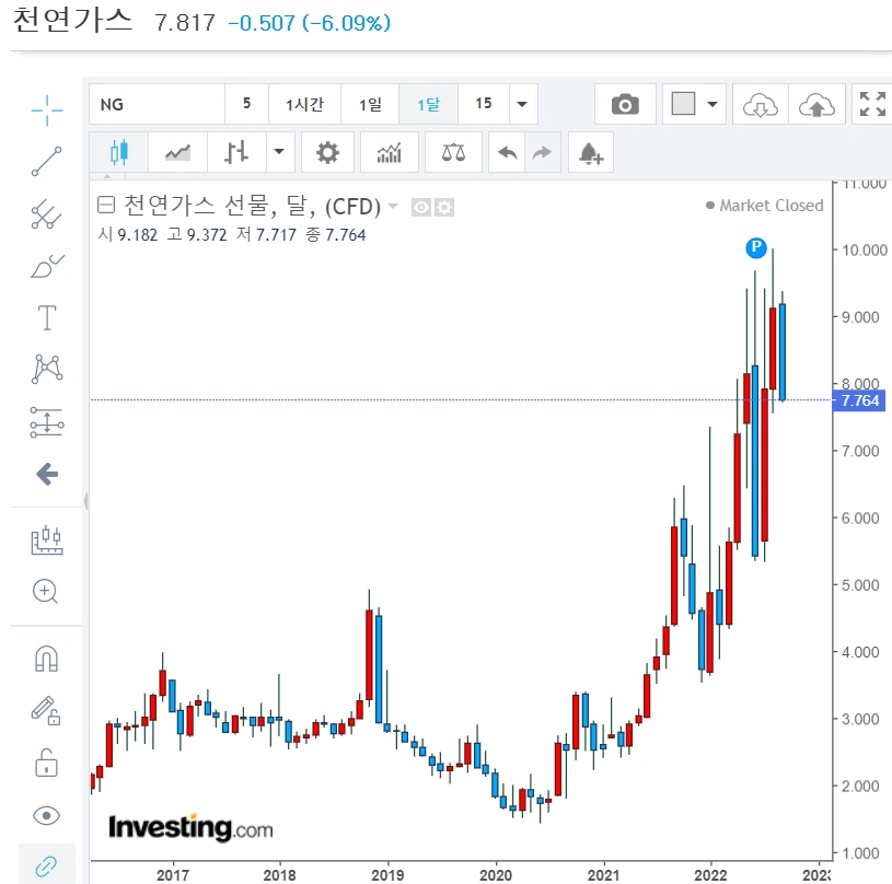 2021년까지 천연가스는 2~ 4달러 내외로 거래되고 있었으나. 2022년 2월 24일 우크라이나 전쟁이 발발한 이후부터 급격히 상승하여 7~8달러 선을 유지하고 있습니다.