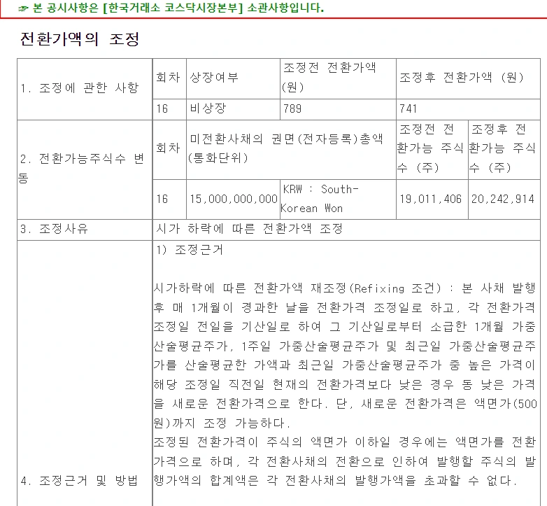 9월 16일, 전환가액이 조정되어 741원이 됐습니다. 7월 18일은 952원->789원. 9월 16일은 781원-> 741원.
