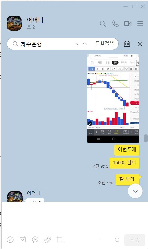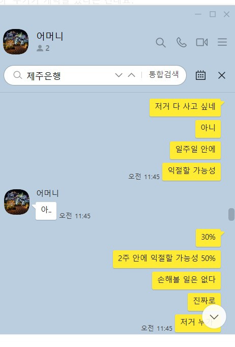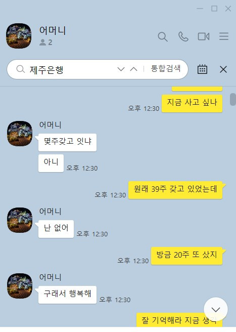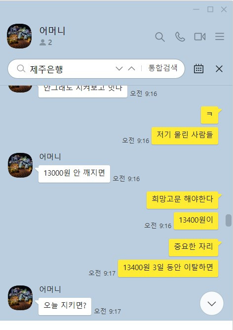 좌측의 사진은 13,000원 초반에서 합류하겠다던 어머니가,,, 저를 안타깝게 여겼던 걸 캡쳐한 사진입니다.