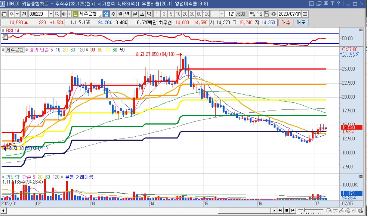 일반 투자자들은 '손절'을 잘 못한다. 즉, 고점에서 매수한 사람은 본인이 원금을 되찾거나 최소한의 수익을 보기 전까지 손절하지 않으려는 경향이 강하다는 것입니다. 주가가 반토막나기 전까지 대략 2달 정도 소요되고, 반토막 즈음에서는 '추가로 매수할 자금'이 없을 것입니다. 제주은행을 예시로 들면, 개인이 대응하기 힘든 급락 시점인 4월 중순부터 6월 중순까지 '아무리 운이 좋았다고 한들' 고점에서 매수한 사람의 평균 단가는 22,000원 부근일 것입니다. 22,000원 부근에 강한 벽이 쌓여있다고 생각하는 데서 그치면, 돈을 벌기는 어렵습니다.