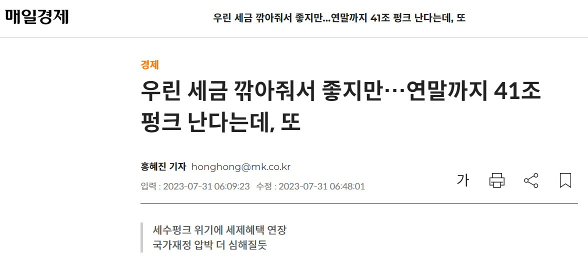 세금 증가율이 경제성장률(=GDP, GDP는 아까 대강 설명했지요?) 증가 속도보다 2배라고 하는데, 뭐 그게 대수인가 싶네요. 그쵸? (사실 보수 언론에서 보도한 것과 진보 언론에서의 논조는 조금 차이가 있긴 하더군요. 그래도 팩트는 달라지지 않습니다.)