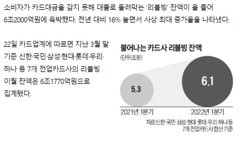 20년 초 1600조원의 가계신용이 2년간 대략 15% 정도 늘어났는데요. 중요한 건 대출의 질이 좋냐 나쁘냐 판단해야 한다는 것입니다. 참고할 수 있는 자료로는 카드 리볼빙 잔고액과 연체율 추이입니다.