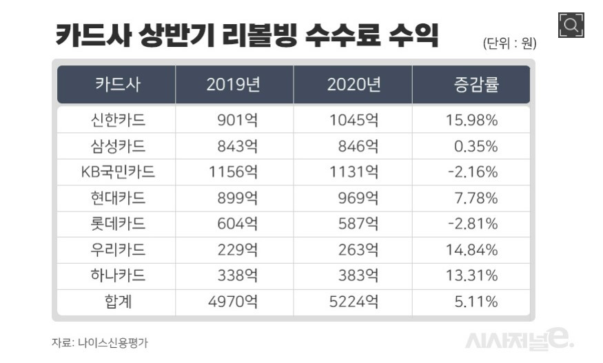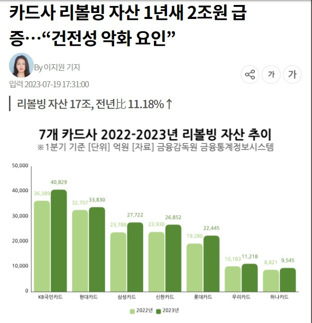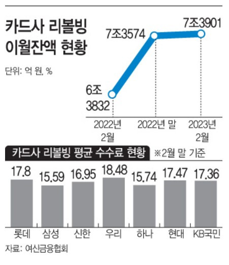 21년, 22년 리볼빙 수수료 수익 자료를 찾아보려 했는데 결국 찾지 못했습니다. 리볼빙 연체율과 리볼빙 잔액 변동 정도를 고려해서 추정하면, 수수료 수익이 대략 2배 늘었을지도.