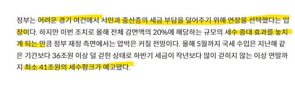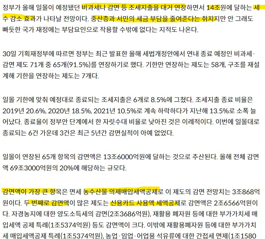 매일경제 홍혜희 기자가 보도한 내용에 따르면, 정부는 국내 경기 부진으로 인해 서민과 중산층의 세금 부담을 덜어주는 결정을 내렸습니다. '비과세 및 과세 감면'혜택을 서민과 중산층에게 연장하여 제공한다고 합니다. 이로 인해 세수는 대략 40조원 정도 감소할 것으로 예상된다고 합니다. 40조 원이 별 거 있나요. 우리나라 최근 예산 증가폭만 고려하면, 그냥 국채 막 찍어내서 돌려막기 해버리면 안되나 싶네요. 관련 자료 한 번 보시죠.
