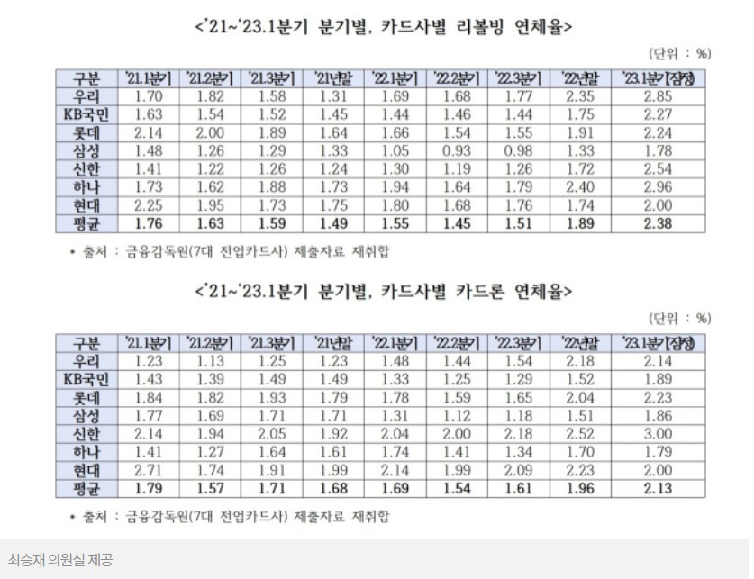 리볼빙 잔액은 21년 1분기 5.3조 수준에 불과했으나 22년 1분기 6조에 육박했으며, 23년 1분기가 종료된 시점에서는 대략 7조 중턱을 넘어서고 있습니다. 연체율도 한 번 살펴보시죠.