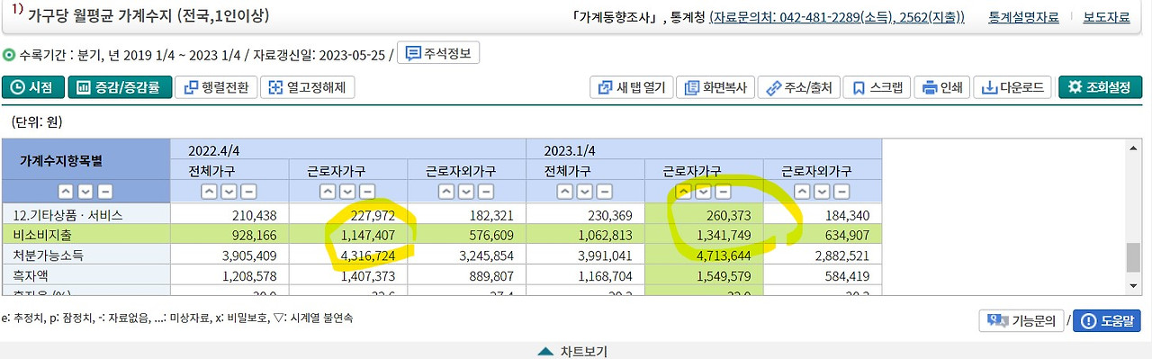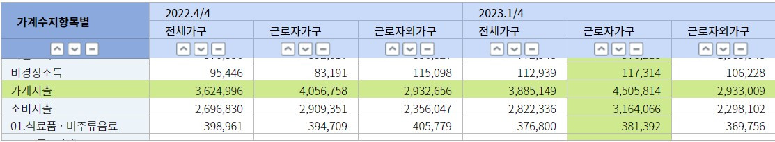 23년 2분기 실질 GDP는 전기 대비 0.6% 증가했습니다. IMF에서 괜히 한국의 23년 GDP 전망치를 3차례 하향 조정한 것이 아니지요. 실질 GDP가 흑자로 나온 까닭은 '수출, 소비, 투자' 모두 전기 대비 하락했지만, '수입의 감소폭'이 수출의 감소폭보다 훨씬 더 줄었기 때문입니다. 원료 및 부속품을 수입하여 가공하고 이를 해외로 수출하는 국가에서 수입을 적게 했다니 의아합니다. 아래의 자료는 GDP 중 가계 지출 부문에 있어 비소비지출의 증가폭이 생각보다 크다는 점을 말하려고 찾아왔습니다.