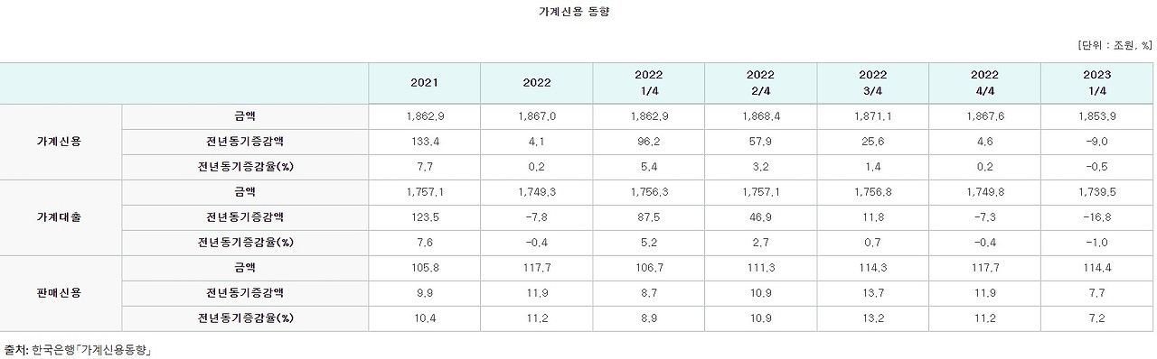 전염병 대유행이 지속됐던 2021년도에도 가계신용은 대폭 상승했습니다. 2022년,2023년의 경우에도 늘어난 가계신용이 더 이상 늘어나지는 않았지만 잔액이 계속 유지되는 상황입니다.