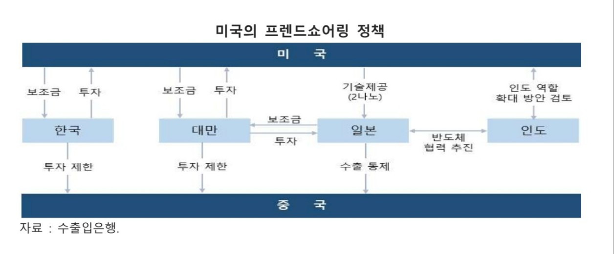 1. 미중 갈등으로 인해 첨단 반도체 산업에 대하여 미국의 프렌드쇼어링이 반도체법(CHIPS)과 여러 국가와의 양자 조약 등으로 가시화되고 있다.
