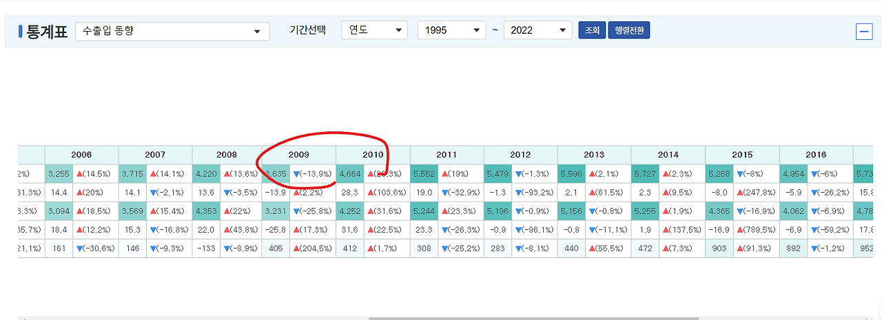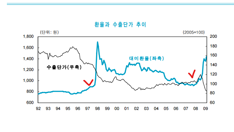 2008년 9월 투자은행인 리먼브라더스가 파산함에 따라 세계 경기는 점차 둔화되었으며, 안전 자산에 대한 선호가 어느 정도 반영됨에 따라 강달러 기조가 형성됐습니다. 원화는 달러에 비해 가치가 약세에 접어들었으며, 환율이 높은 상황임에도 불구하고 수출 물량이 적었던 탓에 수출은 전년 대비 -13.9%로 역성장할 수밖에 없었습니다.