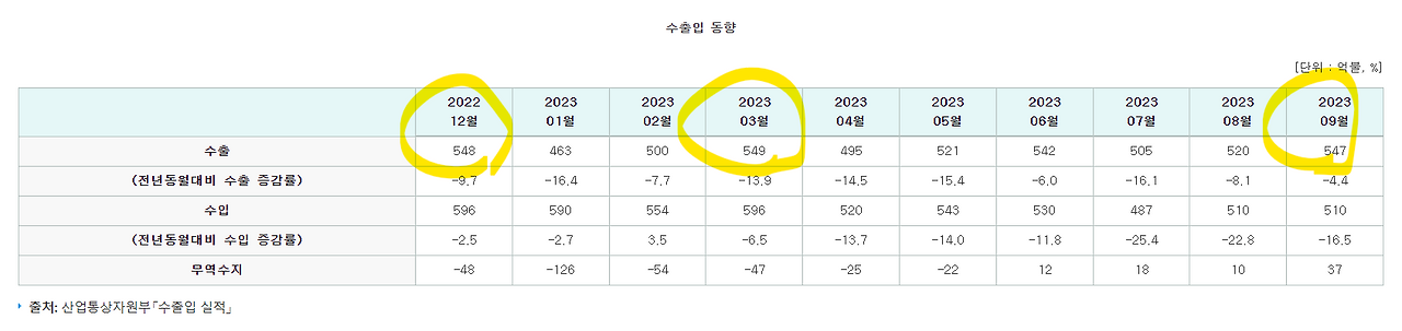 작년 12월부터 대한민국 수출 대금은 등락폭이 상당히 심했습니다. 2023년 1월은 전년 동기 대비 -16.4%로 가장 하락폭이 심했습니다. 올 9월의 경우 전년 동기 대비 -4.4%로 수출 감소폭이 상당히 축소되었습니다.