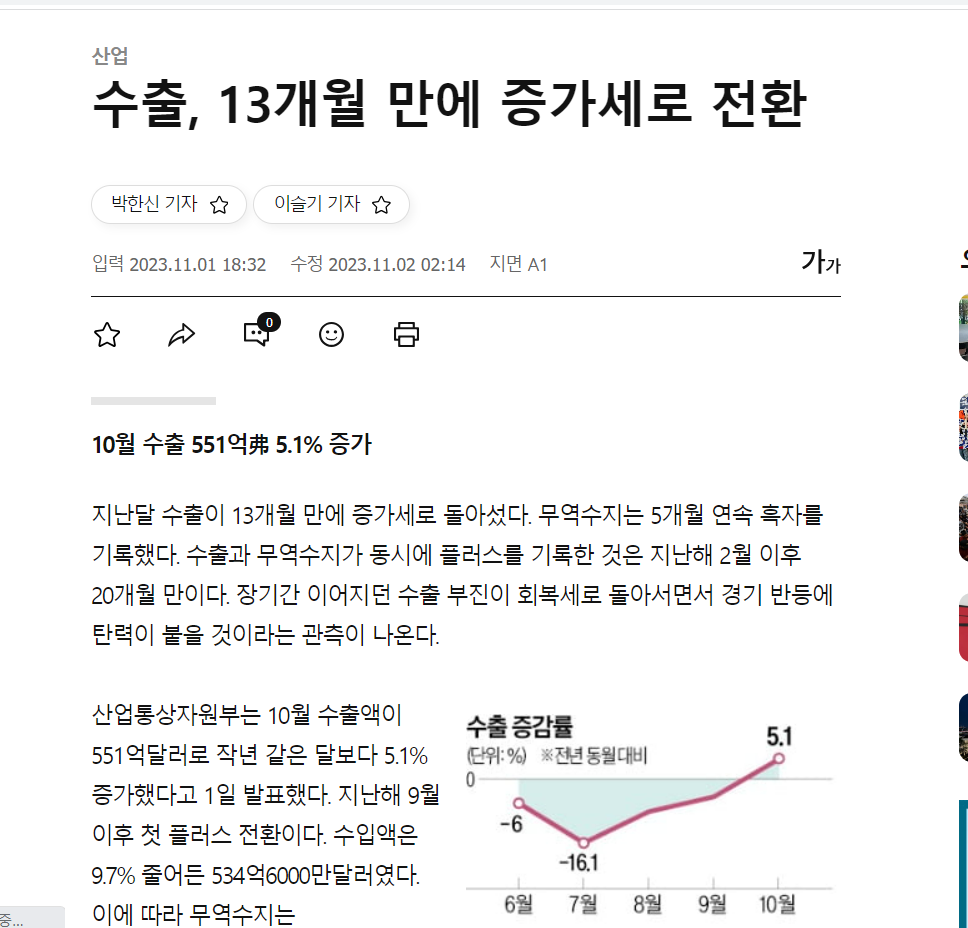 박한신 기자의 자료에 따르면, 수출 증감률이 천천히 회복세에 접어들었다고 합니다.