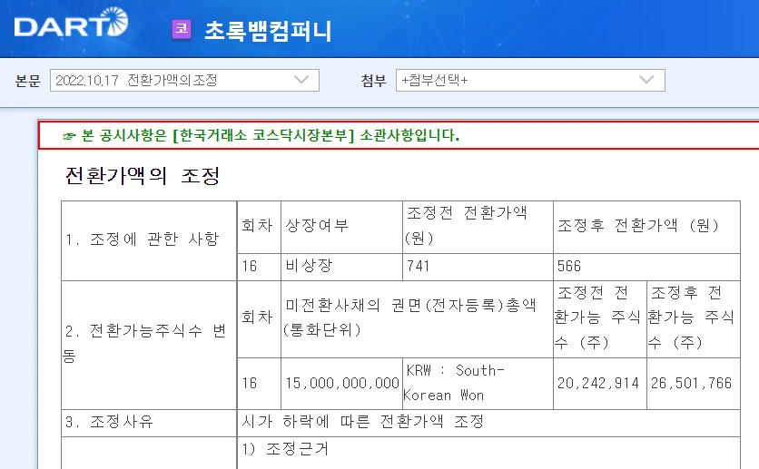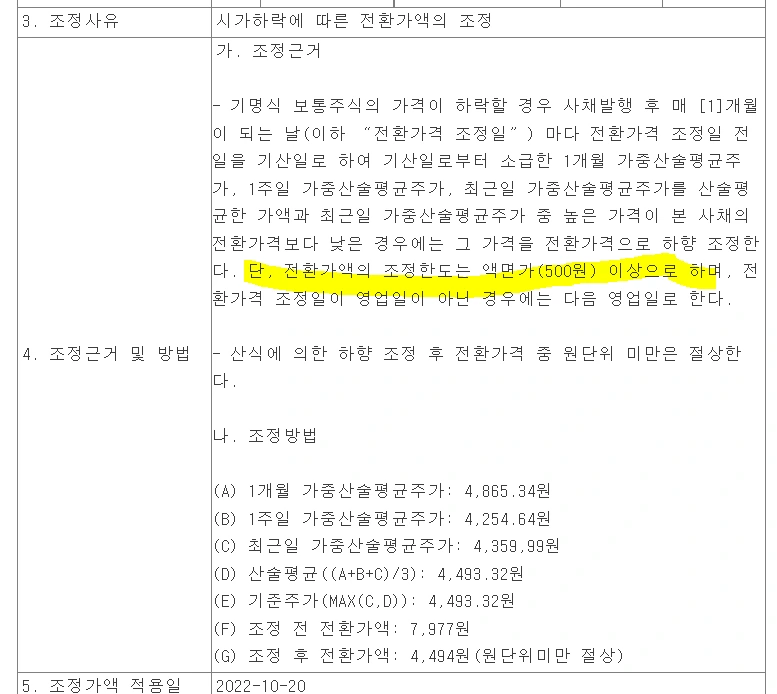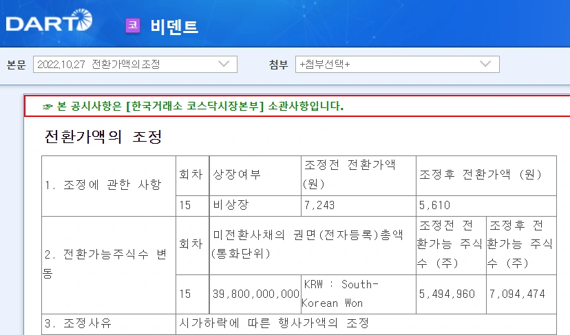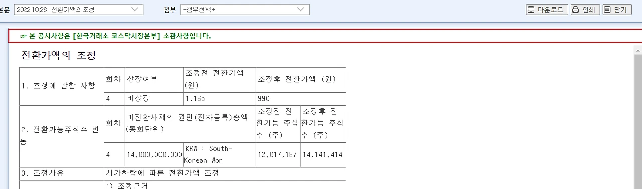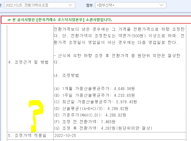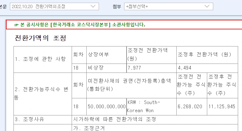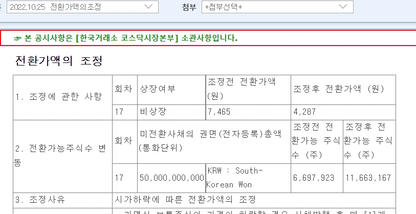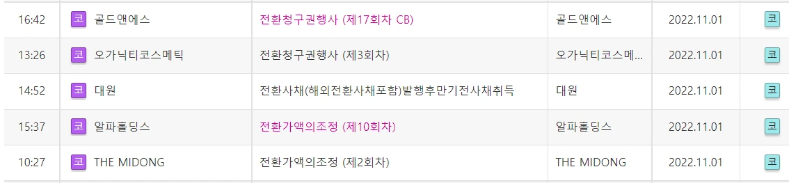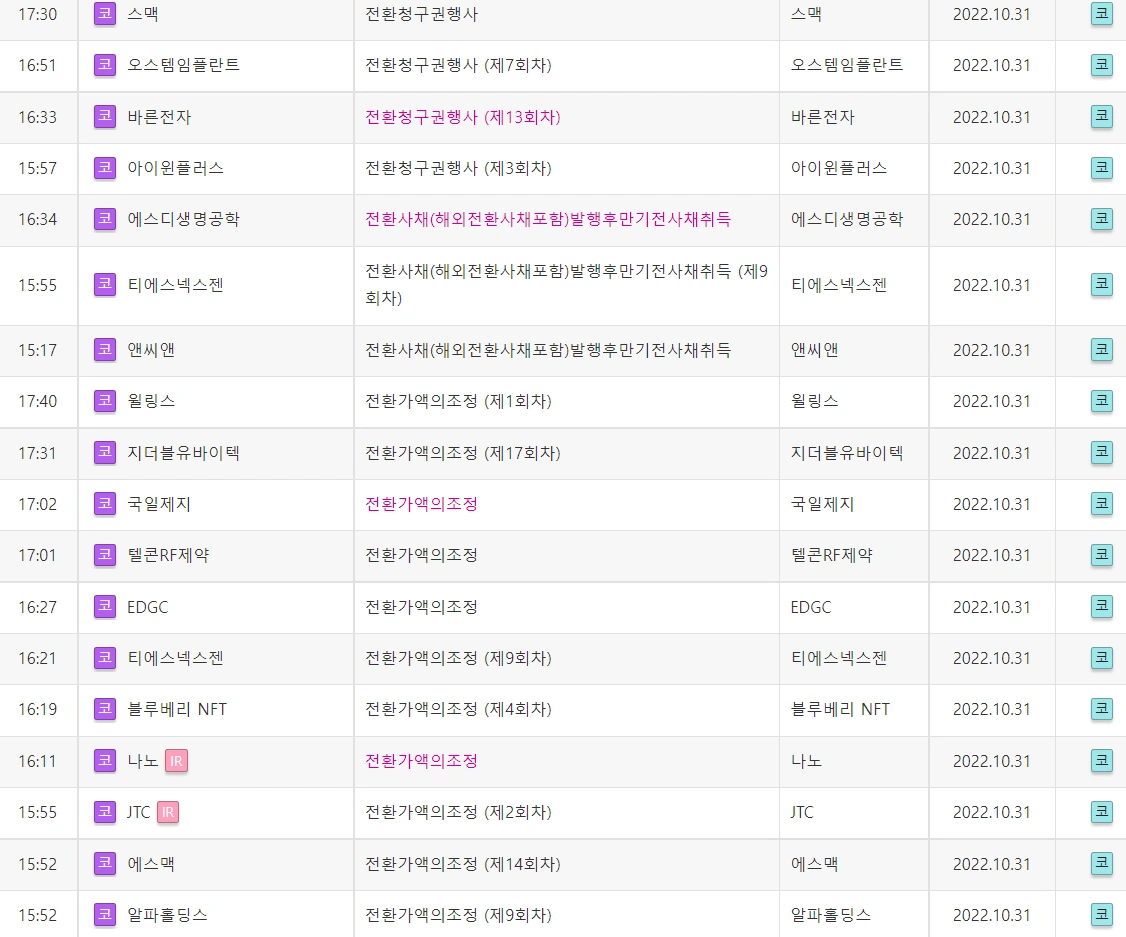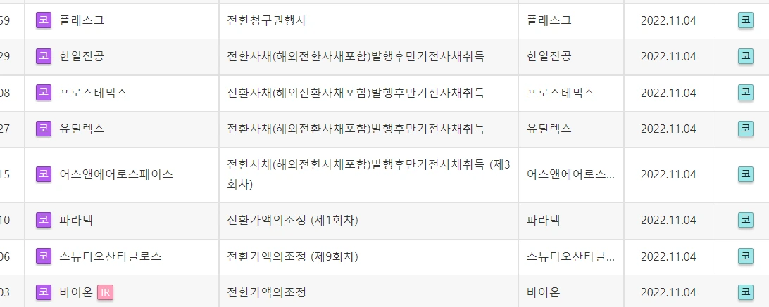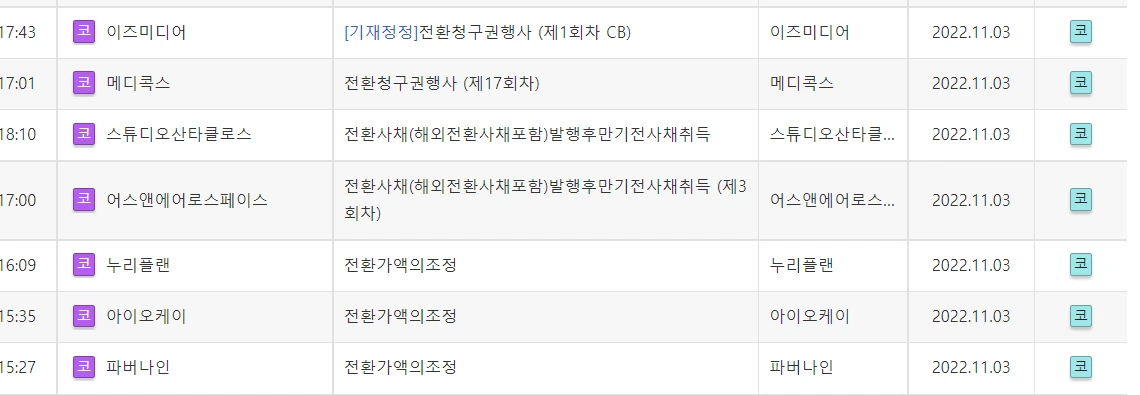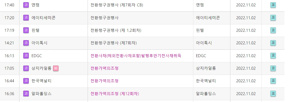 아래에는 11월 4일부터 10월 31일까지 5거래일 동안의 코스닥거래소에 공시된 전환사채 발행 및 조정 내역입니다. 하루도 빠짐없이 나오고 있습니다.