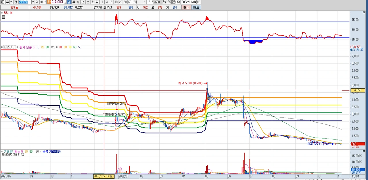 마지막으로 보여드릴 종목은 디와이디입니다. 초여름에 하한가 2번으로 주식이 1/3토막난 상태에서 현재 지속적으로 주가가 흘러내리고 있습니다. 과연 매수할 가치가 있을까요?