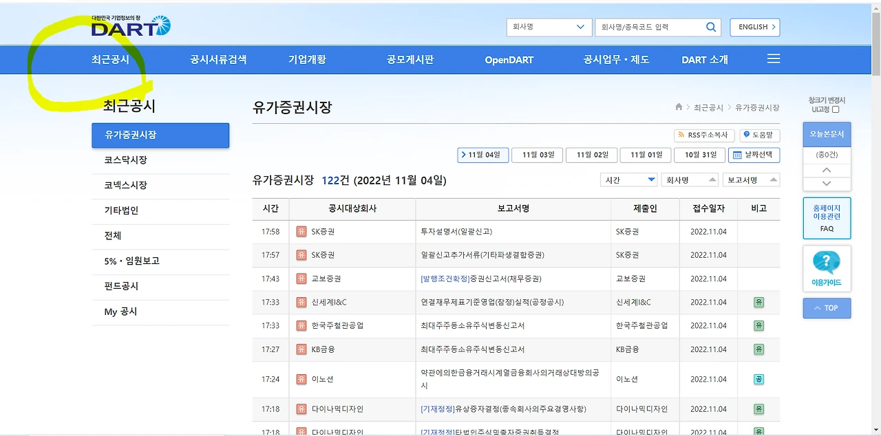 다트에 들어가면, 좌측 상단에 '최근 공시'를 누르면 코스피와 코스닥의 당일 공시를 알 수 있습니다.