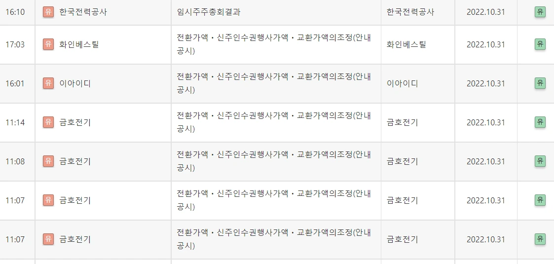 유가증권(코스피)시장과 코스닥 시장의 공시를 일별로 한 번씩 확인해보시면 '전환사채' 관련 공시는 코스닥이 압도적으로 많음을 확인할 수 있습니다. 11월 4일부터 10월 31일까지 5거래일 동안 코스피 시장에서는 하루를 제외하고는 전환사채 공시를 찾기 어려웠습니다.