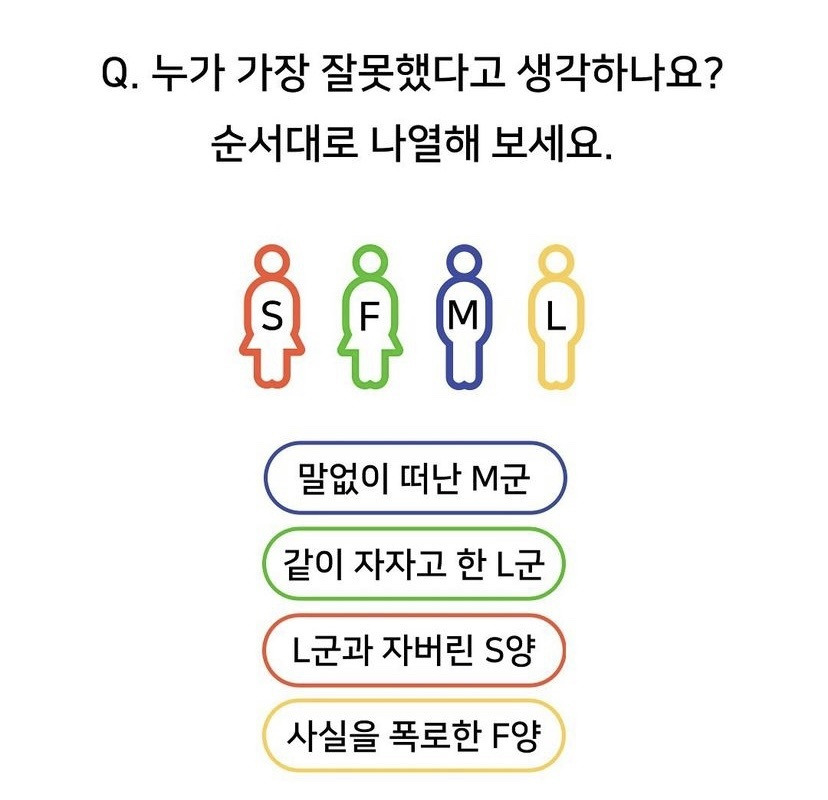 처음부터 되게 흥미롭지 않나요? '애초에' 일의 사단을 야기한 'M'군의 죄책을 가장 중요하게 생각하는 사람도 있을 것이며, 'S양'의 일처리 방식에 대해 의문을 품는 사람도 있을 것입니다. 뿐만 아니라 'L'군의 비겁함에 눈길이 가는 사람도 있을 것이며, 세 사람 간의 '사랑'과는 관계없는 'F'양이 그저 가십거리로서 세 사람의 이야기를 폭로하는 것에 분노하는 사람도 있을 것입니다.
