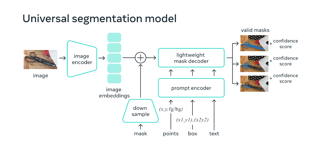 SAM은 이 두 가지 접근 방식을 일반화했다. 즉, 대화형 분할과 자동 분할을 동시에 수행할 수 있는 단일 모델인 것이다. 일반화를 했다는 말은, 실무자가 더 이상 직접 분할 데이터를 수집하고 사용 사례에 맞게 모델을 미세 조정할 필요가 없다는 것을 의미한다. 이미지 분할의 완전 자동화와 일반화를 실현한 것이다.