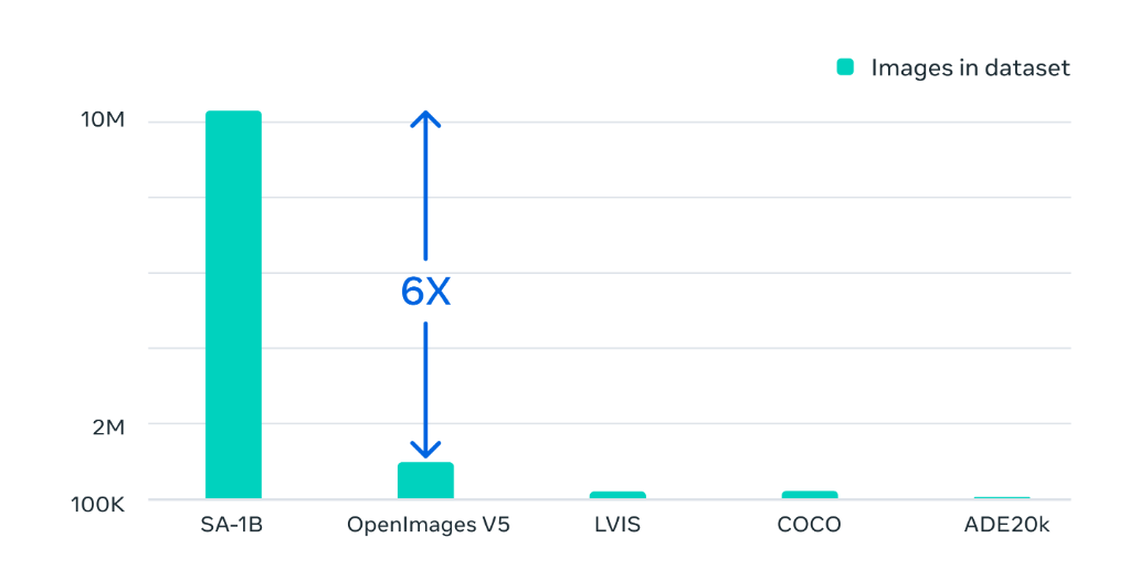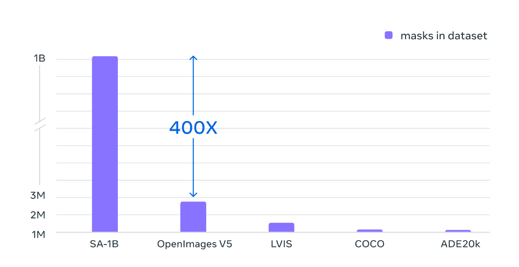 Segment Anything 프로젝트의 비전은 이미지 분할에 필요한 작업(작업별 모델링 전문성, 학습 컴퓨팅, 이미지 분할을 위한 맞춤형 데이터 주석 등)의 필요성을 줄이는 것이다. 이를 위해 메타는 Segment Anything Model 이하 SAM과 데이터셋 SA-1B를 둘 다 구축했다. SA-1B는 사상 최대의 규모를 자랑하는 이미지 분할 데이터셋으로, 모델을 학습시킬 기존의 정보가 많지 않아서 직접 만들었다고 한다. 데이터셋 내의 이미지 수는 기존의 것의 6배에 달하고, 마스크의 경우엔 무려 400배에 달한다.