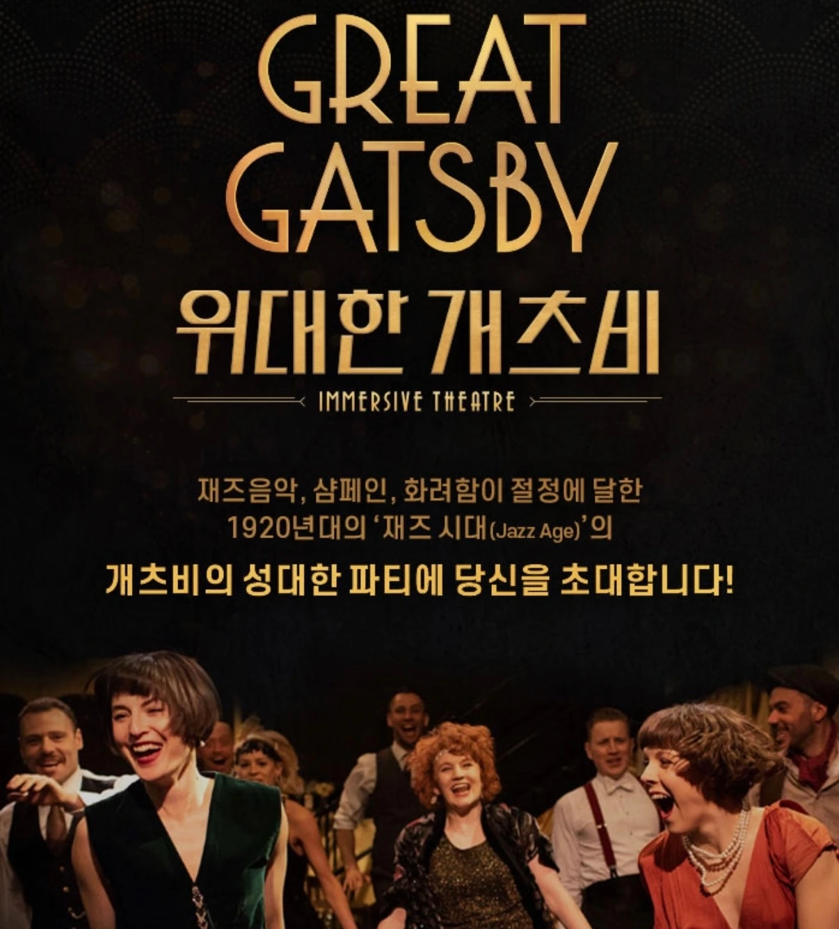 지금은 다양한 이머시브 공연이 있을 듯한데, 국내에서 최초로 공연에 함께하는 이머시브 공연이어서 세 번의 개츠비 공연을 함께했다. 다섯 번은 가야지 했는데, 코로나 여파로 전 공연이 취소되어 버려 아쉬웠던 추억이 있다. 다시 읽어봐도 딱 이머시브 공연에 적합한 <위대한 개츠비>