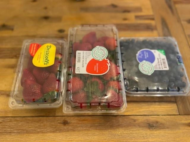 냉장고를 열면 달큼한 딸기가 몇 팩씩 있고 블루베리가 여러 팩이 있습니다.