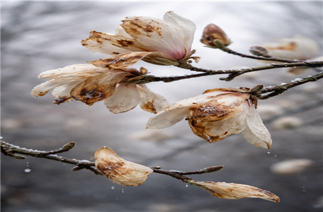 밤새 내린 꽃샘추위에 갈색으로 오그라들던 꽃.