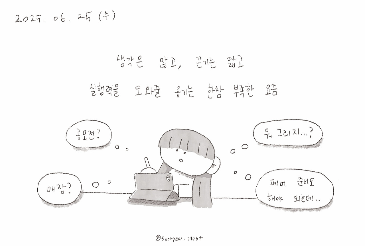 예전처럼 부지런히 그림을 그려서 업로드하지도 않고, 무언가 하고 싶다 하는 뚜렷한 목표의식이 조금 사라져 더 무기력해진 듯 한 나다. 한 해가 지날수록 마음은 더욱더 초조해지고 내가 잘하고 있는 게 맞나? 하며 자신감과 자존감은 점점 쭈구러 들기만 하고, 아무래도 나는 사람들이 좋아하지 않는 것 같아 하는 부정적인 마음만 자라나고 있다.