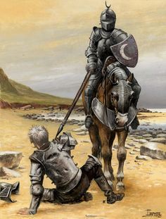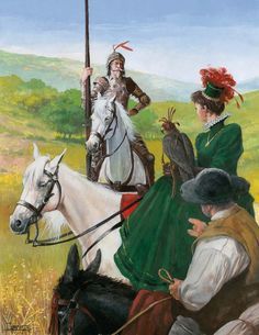 돈키호테의 환타지는 기사의 세계입니다. 그는 스스로 만든 환상의 세계에 완전히 빠져 스스로 기사라고 믿고 있으며 행동도 기사를 흉내 냅니다. 기사는 불의에 분노하며 어려움에 빠진 이웃을 도와주어야 합니다. 그래서 그는 악을 목격하면 지체없이 창을 세우고 돌진합니다. 그러나 겉모습(악한 거인)과 실제(풍차)를 구분을 못해 곤경에 빠집니다. 길에서 한 농부에게 매를 맞는 어린아이를 목격한 돈키호테. 그는 아이를 구해주려 매질을 당장 멈추라고 명령을 내린 후 떠납니다. 그러나 농부는 돈키호테가 떠난 후 아이를 더욱 더 모질게 매질을 합니다. 그는 의롭게 행동하지만 결과는 늘 신통치 않습니다. 또한 기사는 모든 인간을 평등하게 대해야 합니다. 모험 중 돈키호테와 산초가 식사 초대를 받는 자리가 있었습니다. 식사가 준비되자 주인과 함께 앉아 식사하기를 꺼리는 산초에게 돈키호테는 이렇게 말합니다.