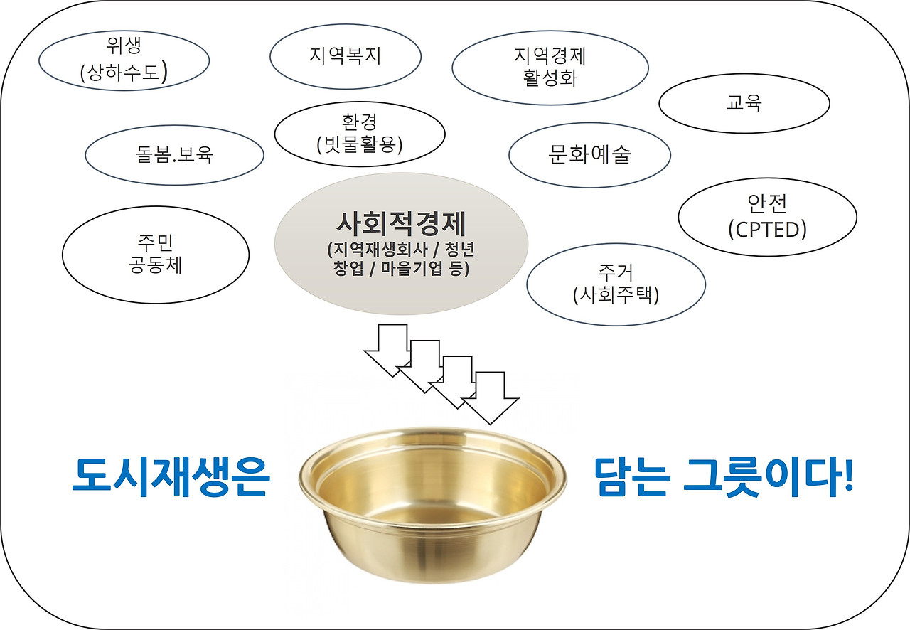 도시재생이 필요한 지역의 주요 쇠퇴 요인이 청년인구의 유출이라면, 청년주택 등의 주거문제와 청년일자리를 핵심 콘텐츠로 담을 수 있다. 마을의 안전, 집수리 등이 필요하다면, 마을안전, 집수리 관련 콘텐츠를 핵심적으로 담아내면 된다. 도시재생사업은 도시의 다양한 쇠퇴 요인을 담아서 기능을 회복시키는 플랫폼이기 때문이다. 도시재생 플랫폼에 사회적경제도 담아낼 수 있다.