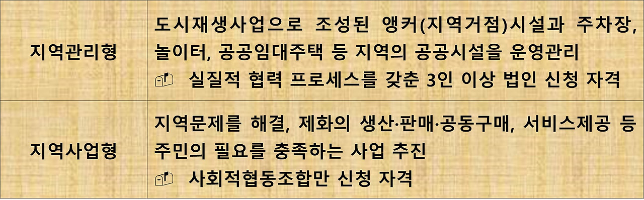 프랑스 사례를 잠시 보면, 새로운 공공으로 지역관리기업(Rágis de quartier)들이 활발하게 활동한다. 프랑스 지역관리기업은 두 가지 유형이 있다. 인구밀도가 높은 서민주거지역에서 조직되는 지역관리기업(Rágis de quartier)과 인구밀도가 낮은 지역에서 조직되는 낙후지역관리기업(Rágis de territoire)으로 유형화 한다.