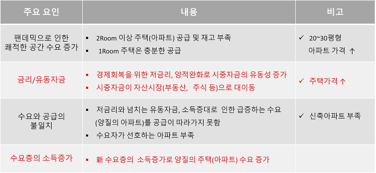 주택가격의 상승요인은 매우 복잡하다 코로나19 팬더믹 등으로 인한 양적완화, 저금리 및 사회적 거리두기에 의한 쾌적한 사적 공간 소유열풍, 수요층의 소득증가 등이 주요 요인일 것이다. 이런 이유로 천정부지로 솟구치는 집값을 지금과 같은 주택 공급 대책만으로는 잡기 어렵다. 시중에 흘러넘치는 유동성 자금이 부동산, 주식 등의 자산시장으로 넘치는데, 치료와 처방전은 공급대책이라는 희대의 오진을 한 그분들의 생각을 듣고 싶다.