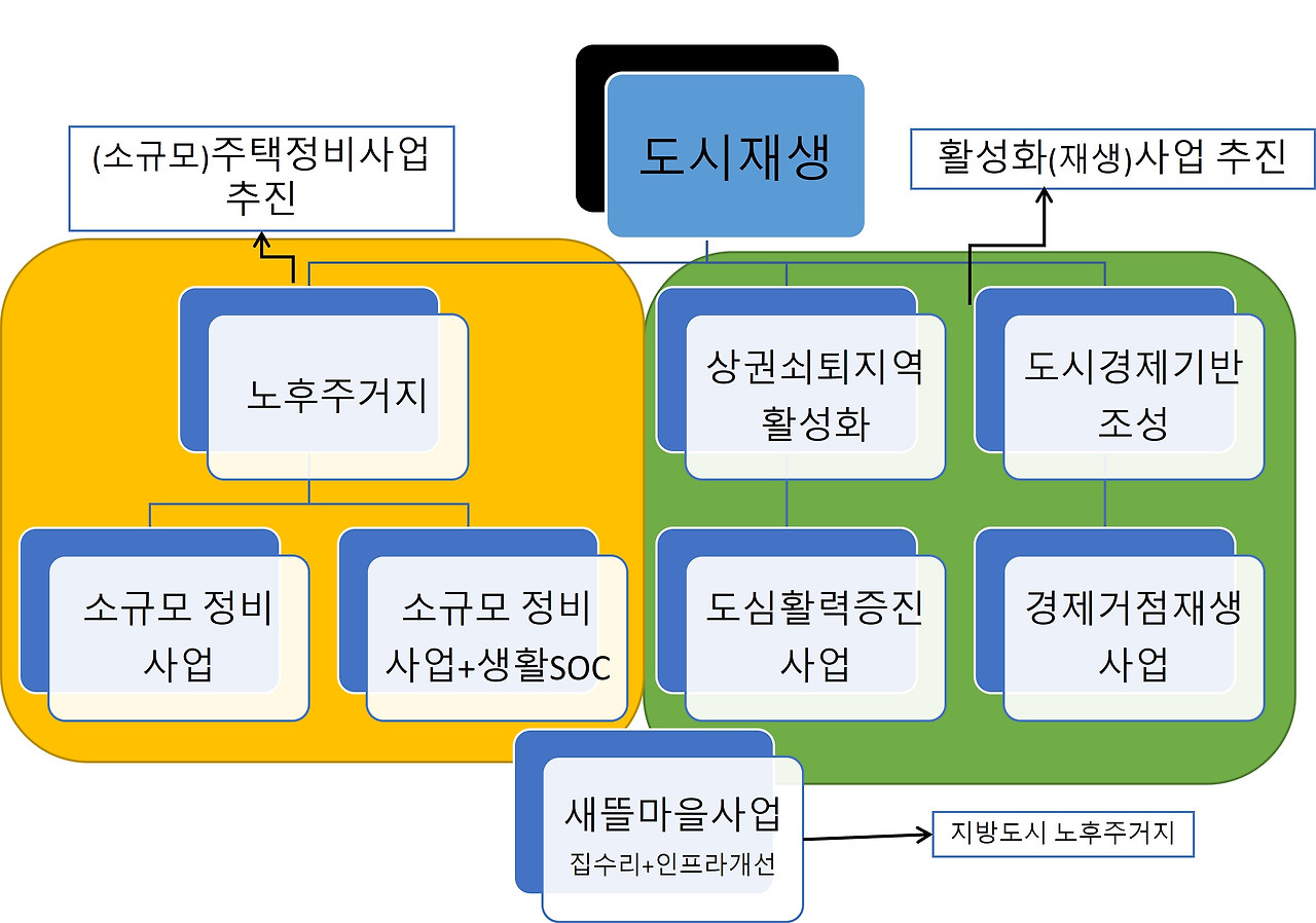 도시재생을 광의의 개념으로 본다면, 저층 노후주거지는 소규모 정비사업으로, 상권쇠퇴지역(원도심)은 활성화사업으로 이원화하여 추진해야 한다. 물론 원도심 활성화 사업도 일본에서 주로 쓰는 경제거점 개발사업을 포함하기 때문이다.