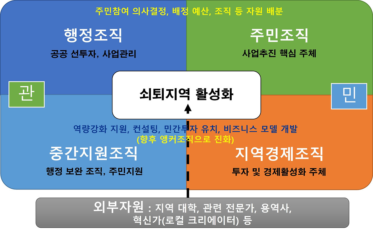 이상적인 도시재생 거버넌스 구조는 아래 그림과 같이 행정조직, 주민조직, 중간지원조직, 지역경제조직, 외부자원이 톱니바퀴처럼 잘 맞물려야 되지만, 현실은 그렇지 않았다.