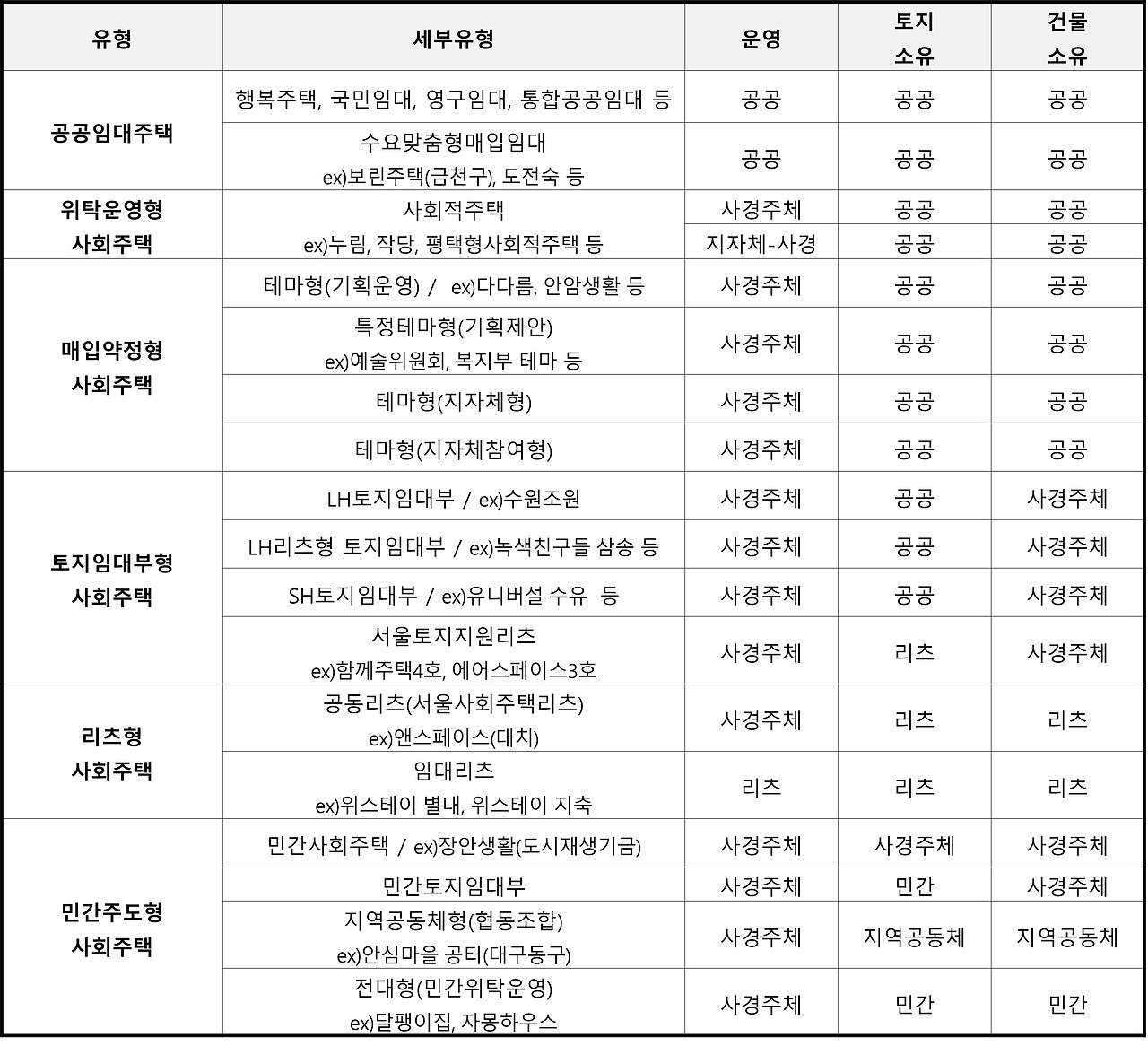 한국의 사회주택은 광의개념으로 볼 때, 6가지 유형으로 나눌 수 있다. 공공임대주택, 위탁운영형 사회주택, 매입약정형 사회주택, 토지임대부형 사회주택, 리츠형 사회주택, 민간주도형 사회주택으로 유형을 나눌 수 있다. 세부적으로 분류하면 유형의 가지 수는 더 많아진다. 한국에서 사회주택의 유형이 다분화된 것은 한국형 사회주택 모델을 찾아가기 위한 다양한 혁신적 시도의 결과였다.