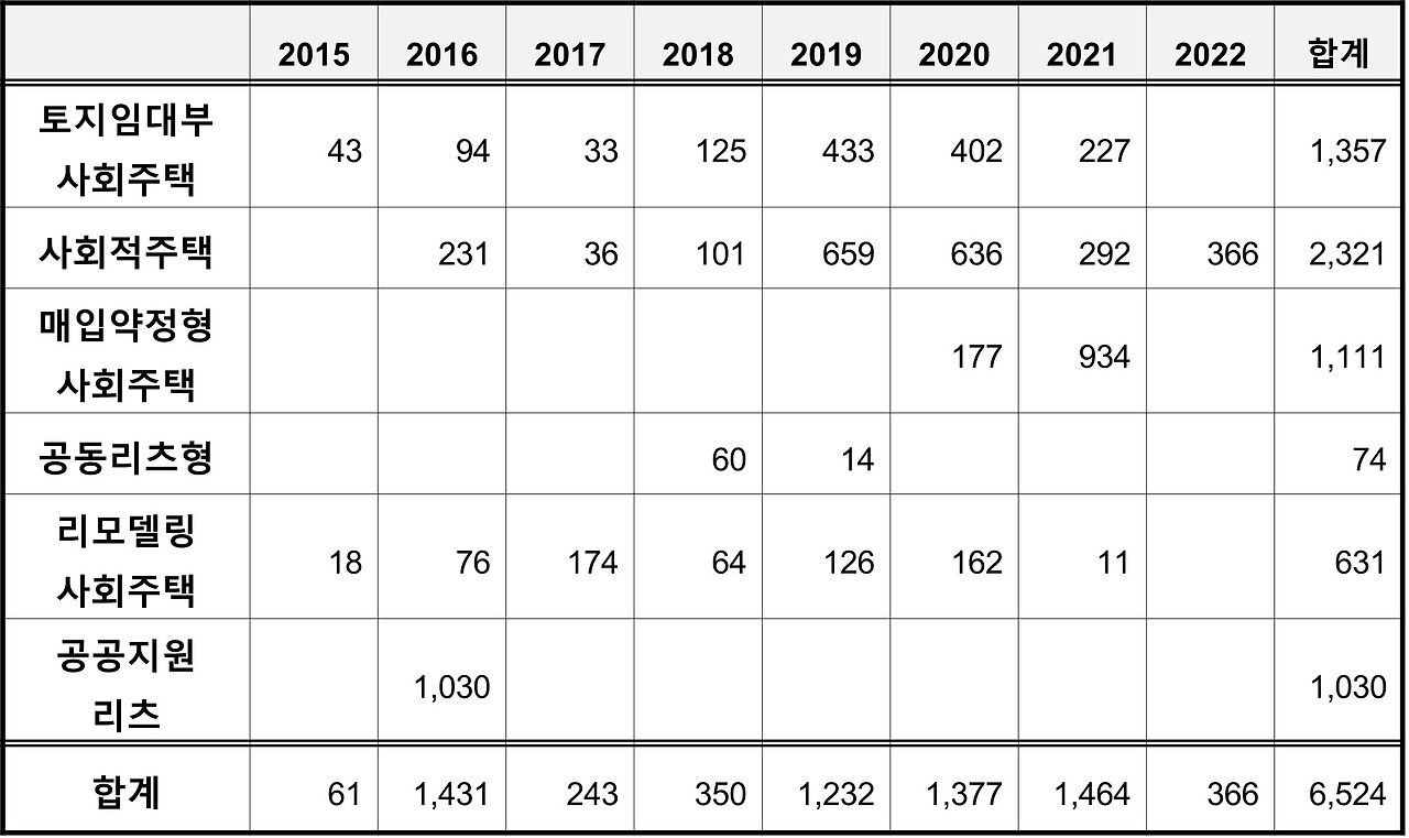 연도별-유형별 사회주택 공급현황은 다음과 같다. 연도별 공급은 2019년, 2020년, 2021년도가 1000호 넘게 공급하였으나, 2022년 들어 서울시 사회주택사업의 신규 공급 중단으로 공급량이 축소한다.