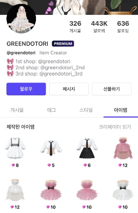 마지막으로 소개해드릴 크리에이터는 GREENDOTORI인데요. 다양한 이미지를 연출할 수 있는 많은 아이템을 보유하고 있는 것이 특징인데요. 리본이나 넥타이를 통한 포인트를 많이 활용합니다.