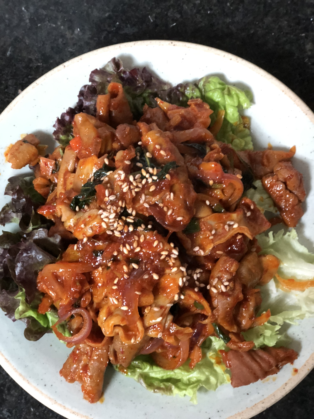 한국에서 사온 곱창은 채소를 더해 볶고 묵은 꼬숩게 무쳤다.