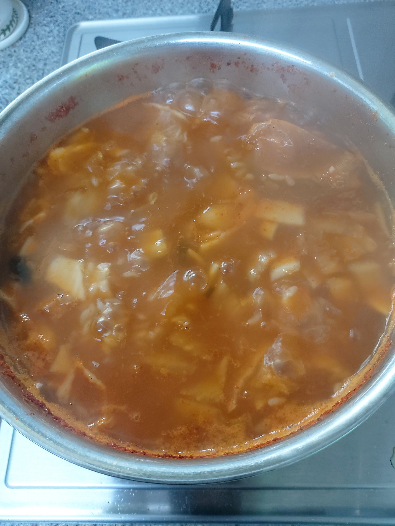 밥알이 흐물흐물해질 때까지 끓여 완성한 김치 국밥