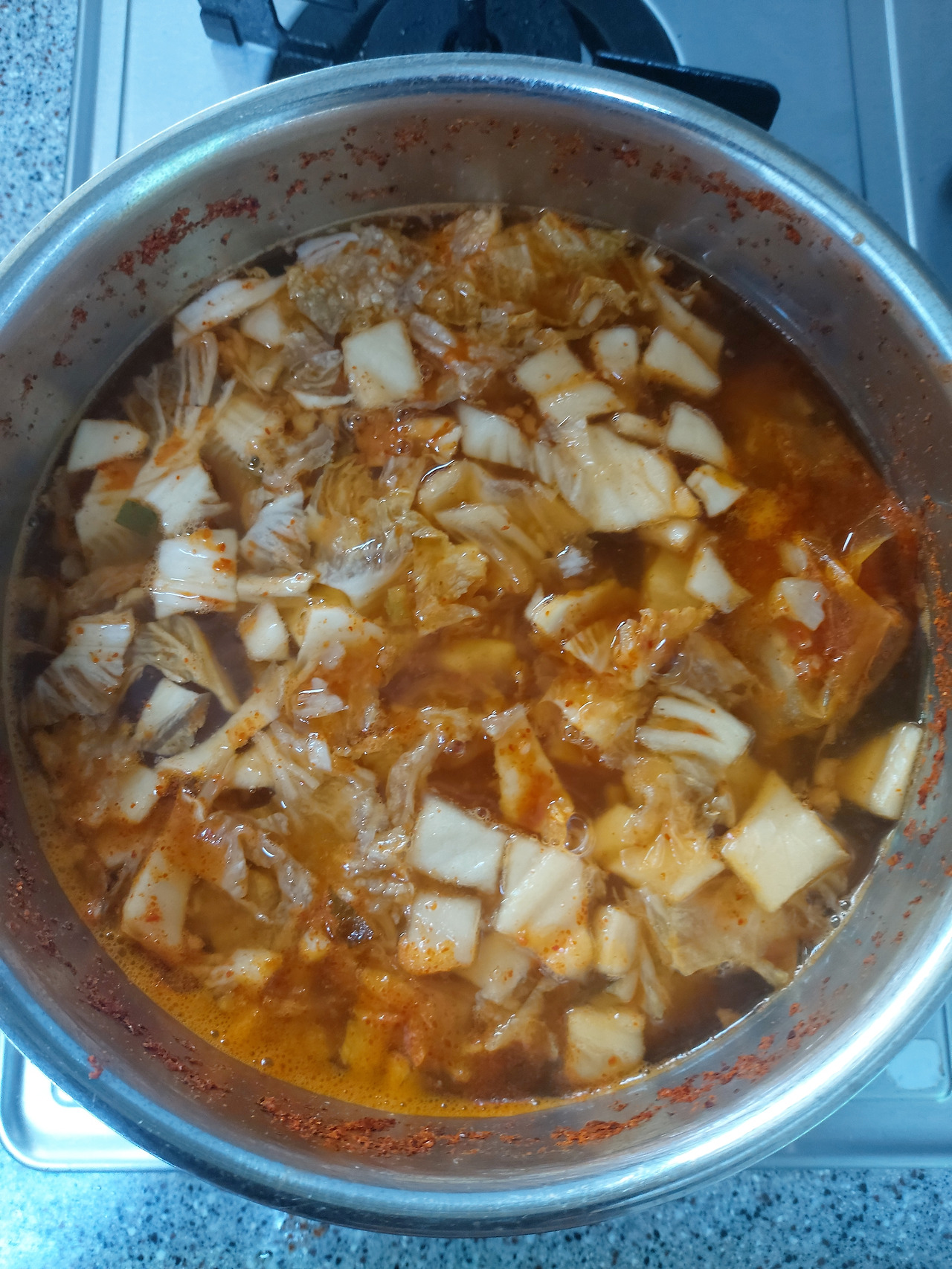 육수가 끓으면 준비한 김치를 넣는다.