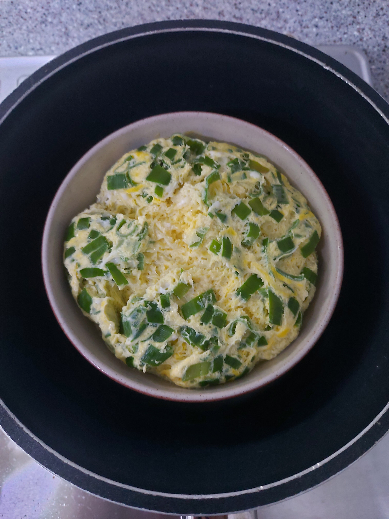 냄비에 물을 붓고 찐 달걀찜. 김치 국밥과 먹으면 금상첨화다.