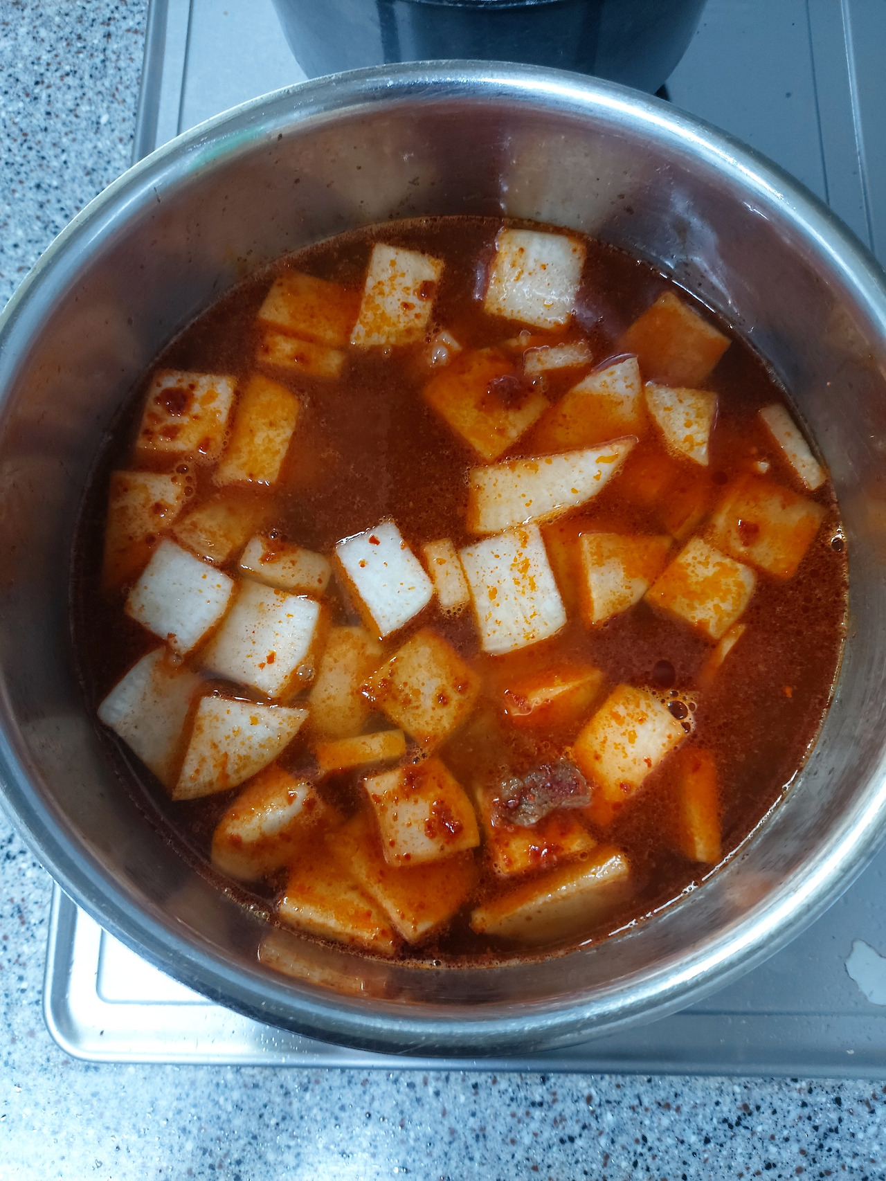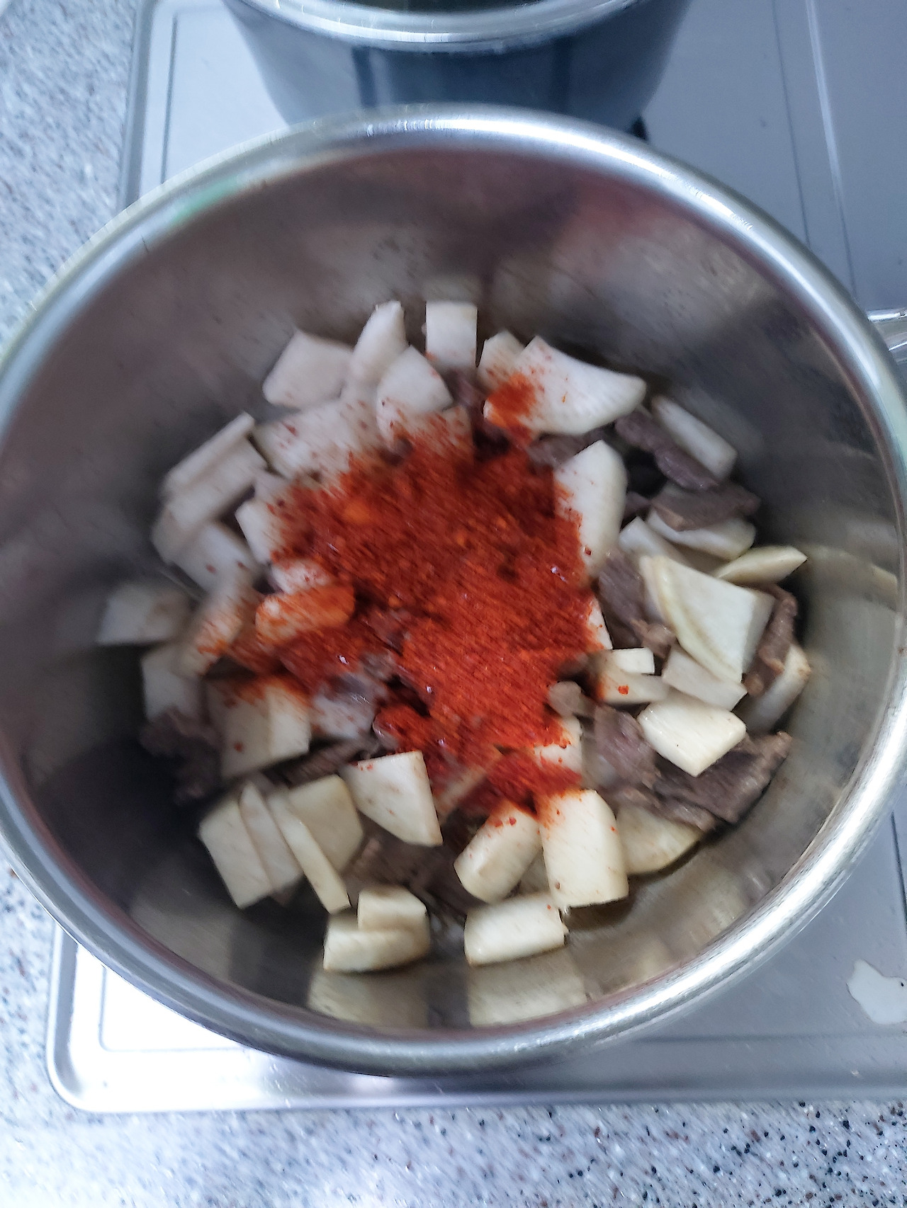 2. 소고기와 무가 어느 정도 익으면 고춧가루 두 큰술을 넣고 계속 볶는다.