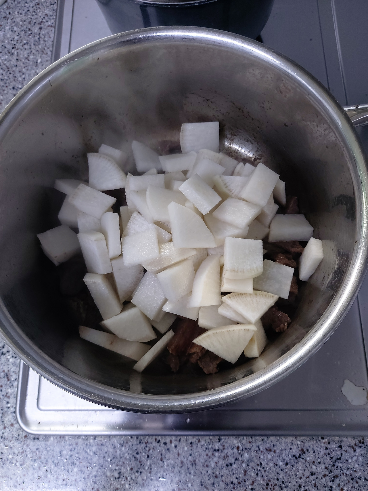 소고기가 어느 정도 익으면 나박썰기한 무를 넣고 볶는다.