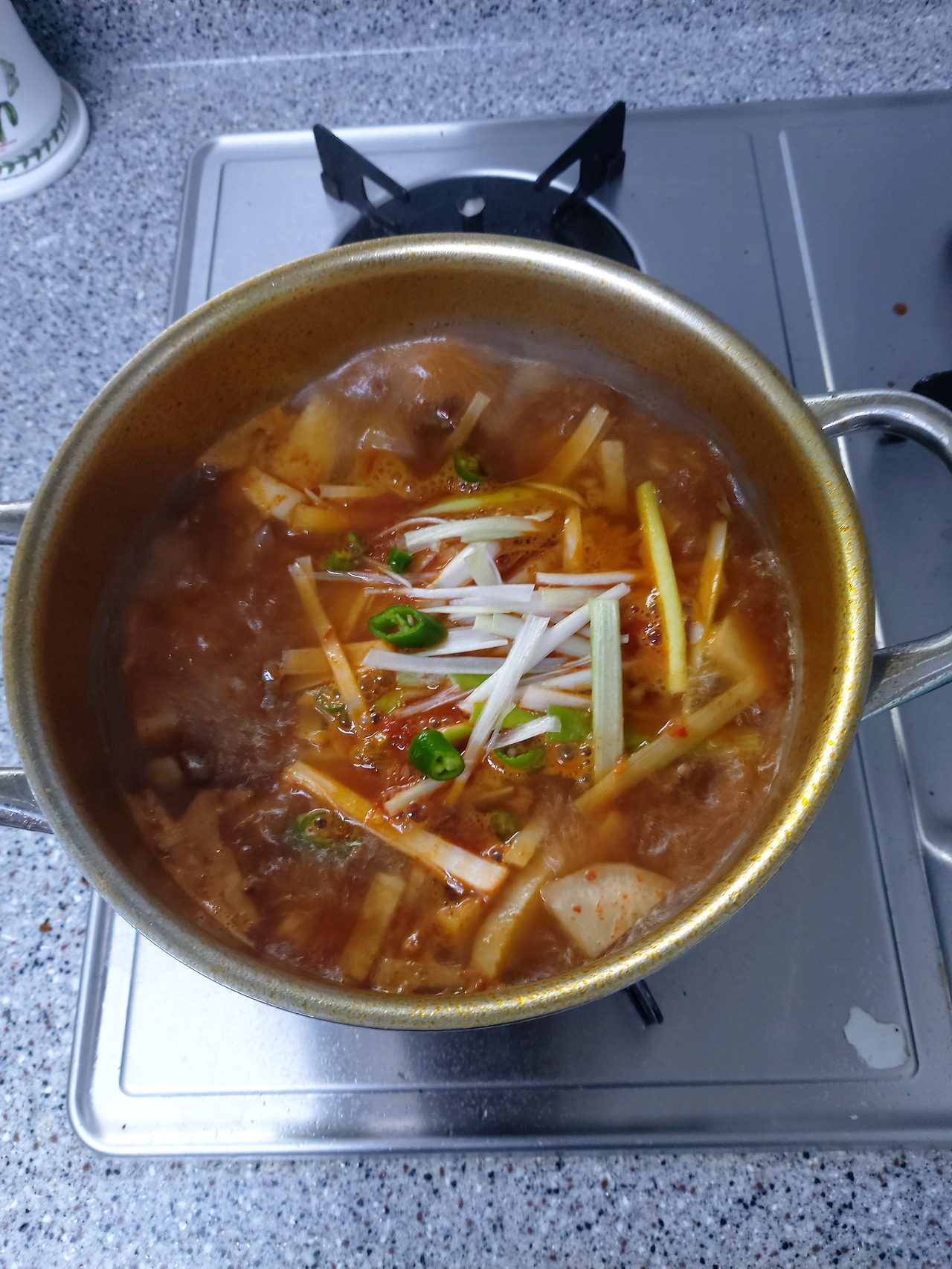 물이 비등점을 돌파하고 10여 분이 지난 뒤 대파와 청양고추를 넣고 2분 후 후추와 참기를 뿌린 뒤 불을 끈다.