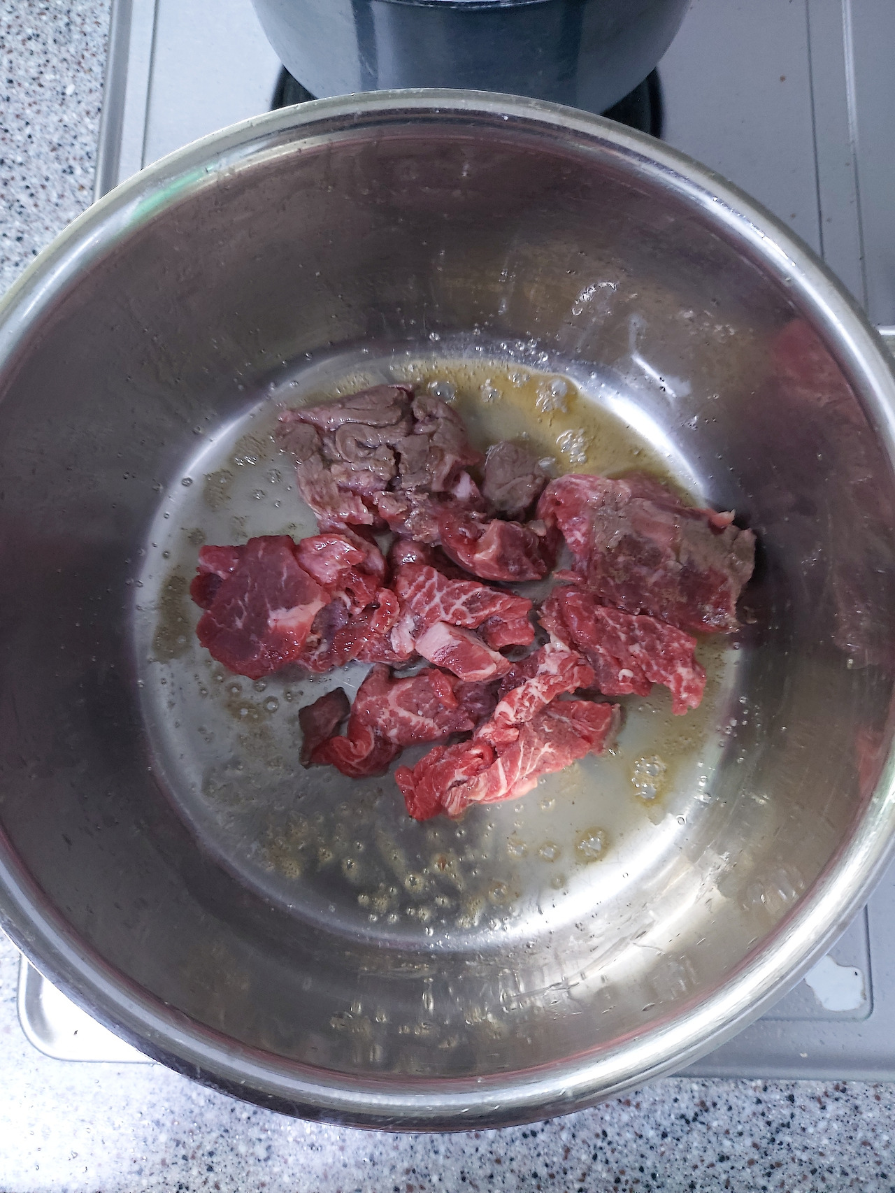 냄비에 참기름을 두르고 소고기를 달달 볶기 시작한다.