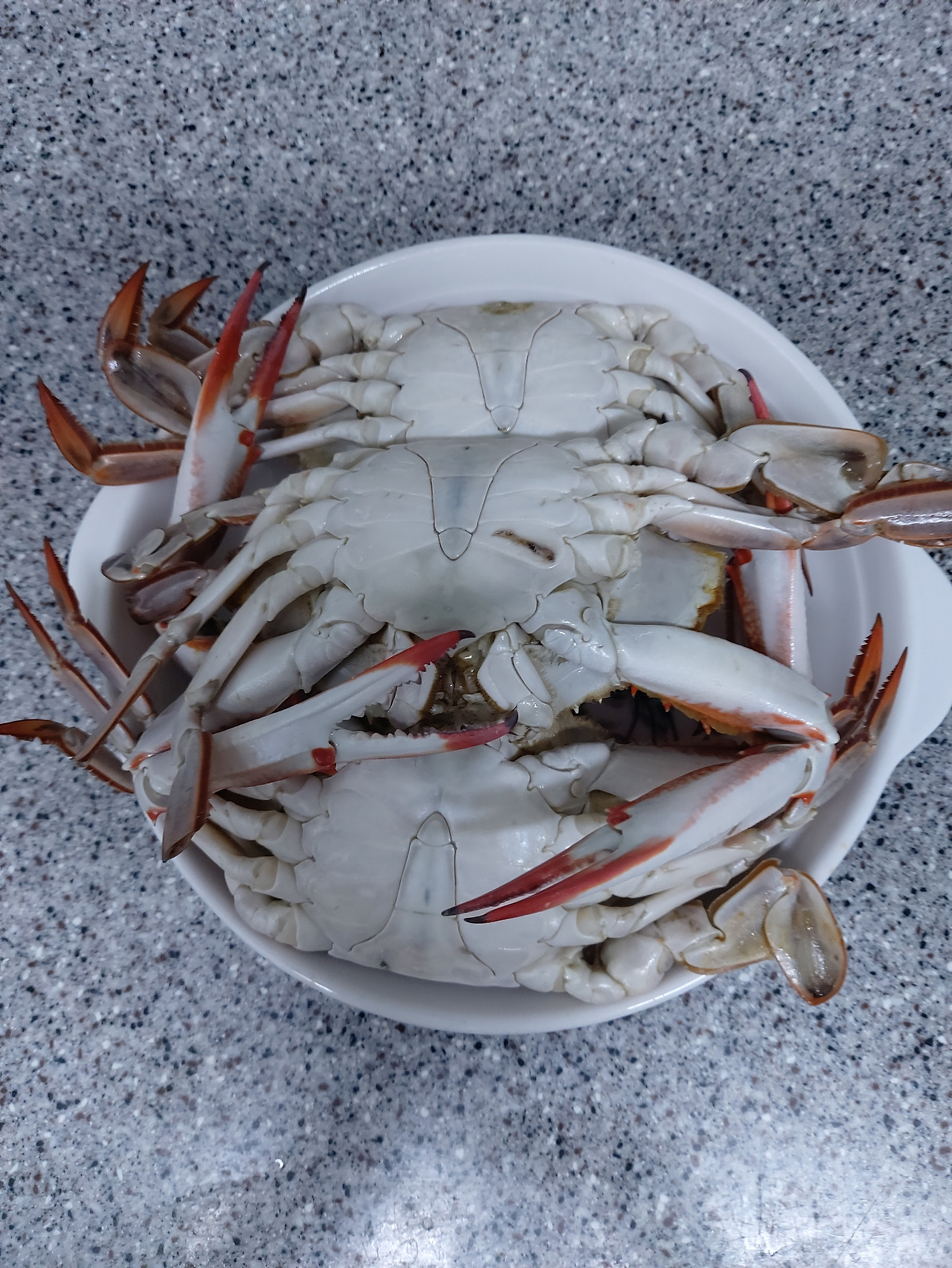 완성된 꽃게찜. 배 부분의 긴 삼각형 모양에서 수꽃게임을 알 수 있다. 암꽃게의 배는 넓고 둥글다.